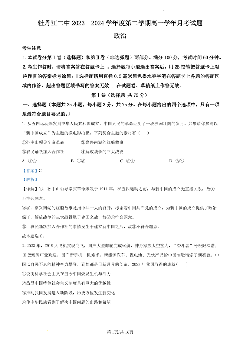 黑龙江省牡丹江市第二高级中学2023-2024学年高一下学期6月月考政治(精品解析版)