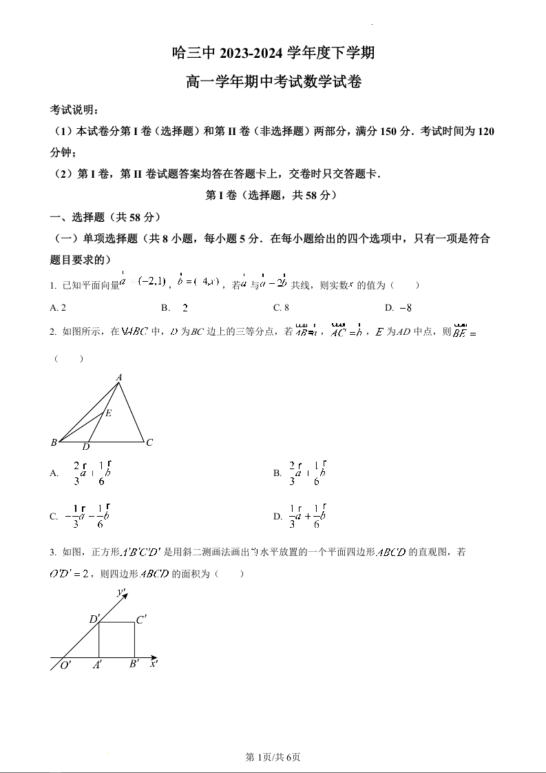 黑龙江省牡丹江市第三高级中学2023-2024学年高一下学期期中考试数学(原卷版)