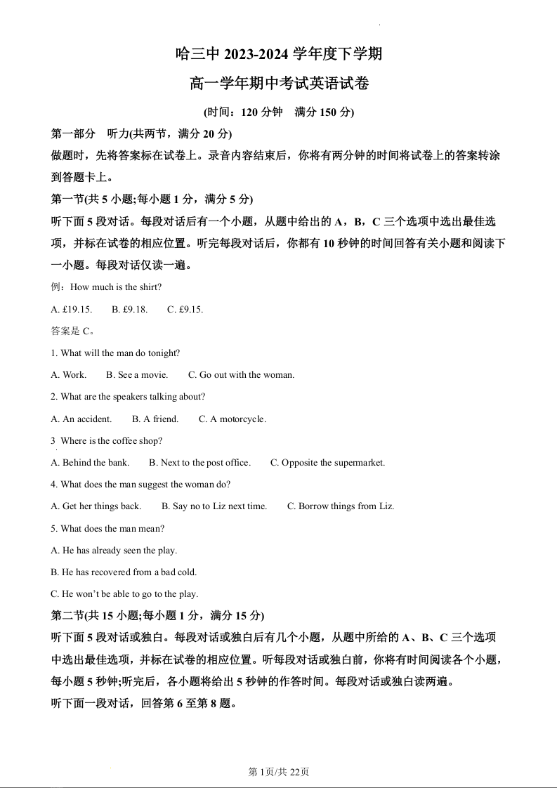 黑龙江省牡丹江市第三高级中学2023-2024学年高一下学期期中考试英语(精品解析版)