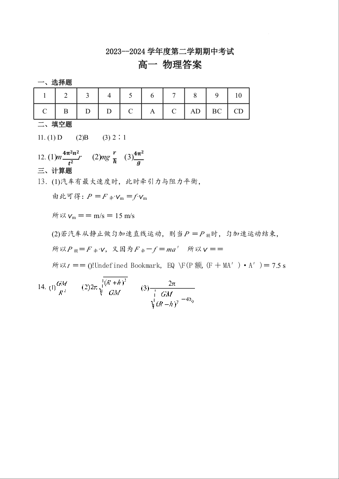 黑龙江省牡丹江市第三高级中学2023-2024学年高一下学期期中考试物理答案