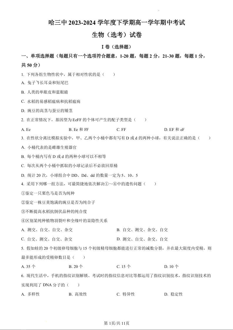 黑龙江省牡丹江市第三高级中学2023-2024学年高一下学期期中考试生物(原卷版)