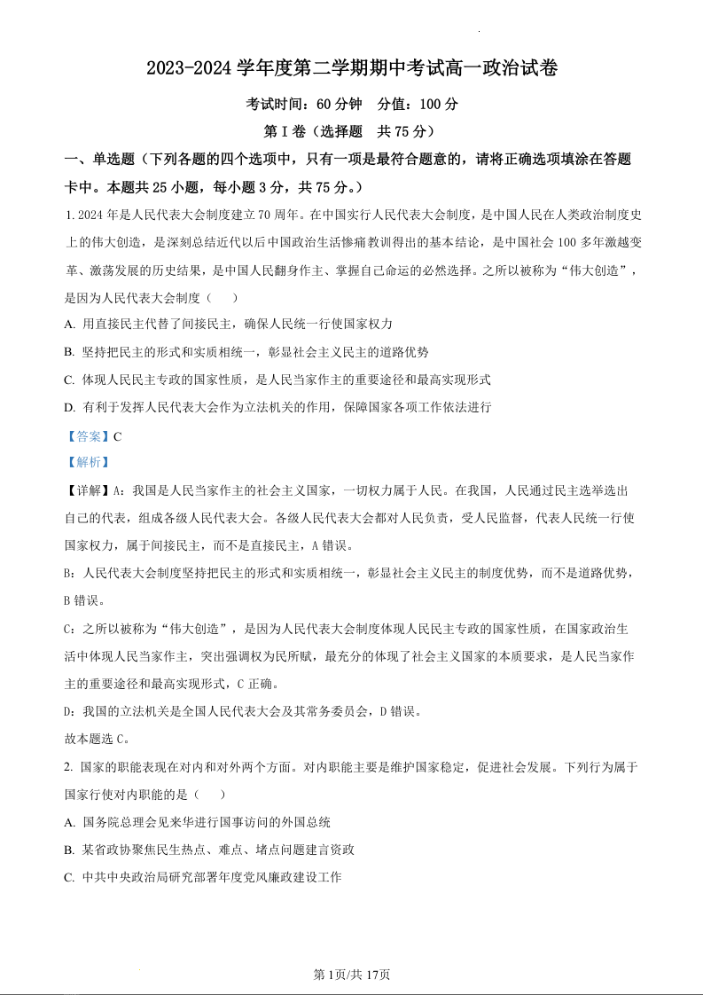 黑龙江省牡丹江市第三高级中学2023-2024学年高一下学期期中考试政治(精品解析版)