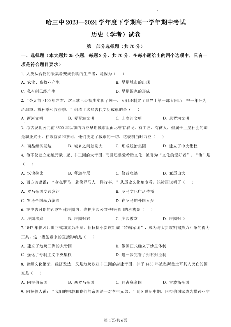 黑龙江省牡丹江市第三高级中学2023-2024学年高一下学期期中考试历史(原卷版)