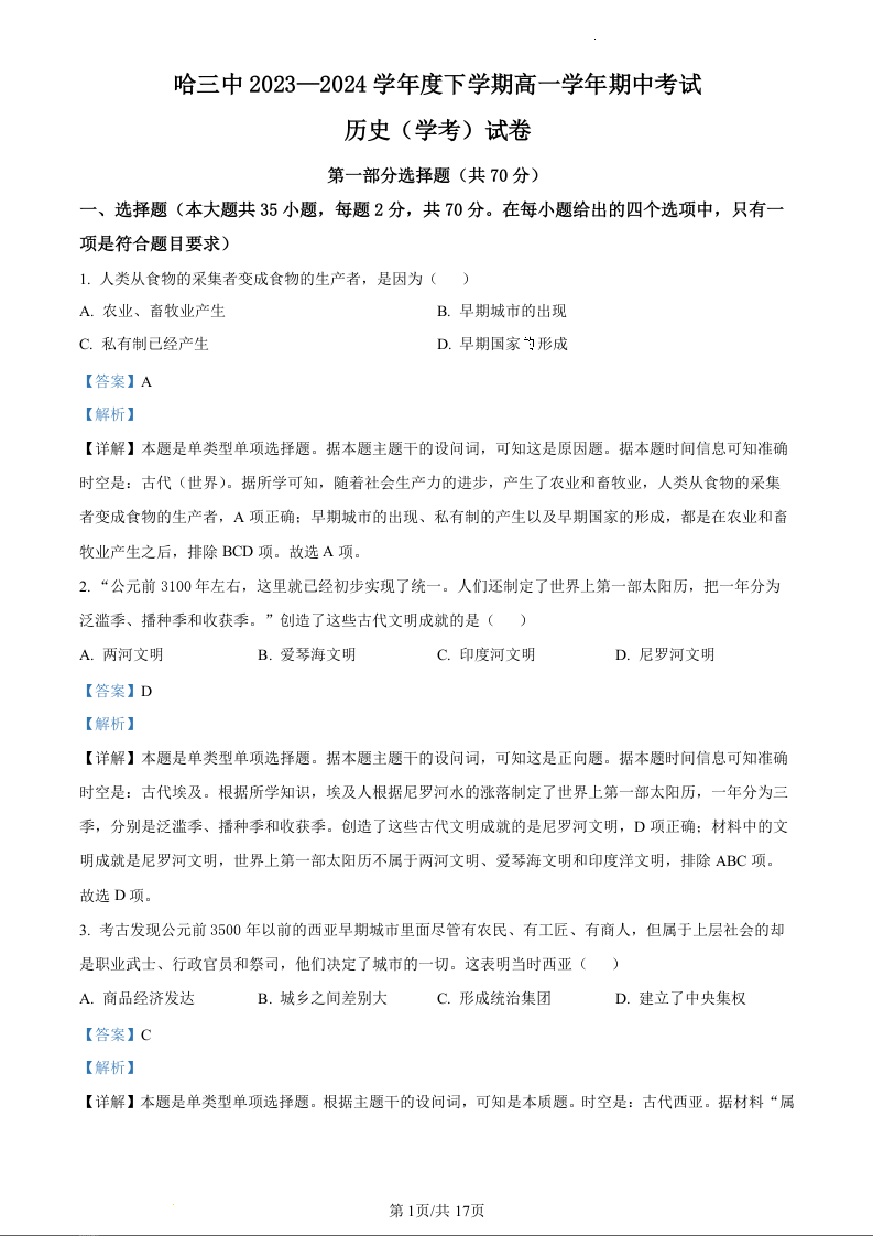 黑龙江省牡丹江市第三高级中学2023-2024学年高一下学期期中考试历史(精品解析版)