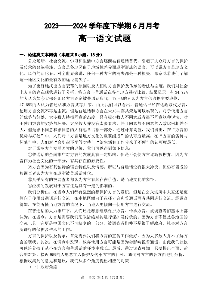 黑龙江省齐齐哈尔市第八中学校2023-2024学年高一下学期6月月考语文