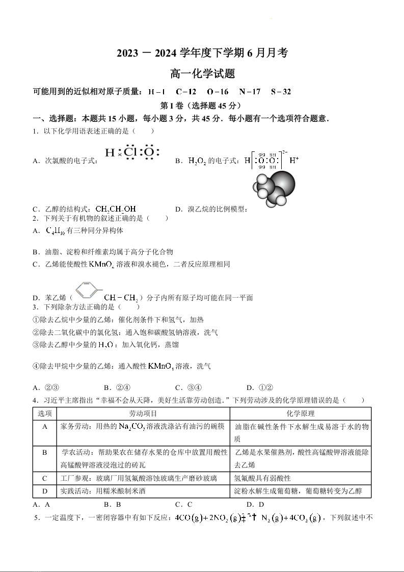 黑龙江省齐齐哈尔市第八中学校2023-2024学年高一下学期6月月考化学