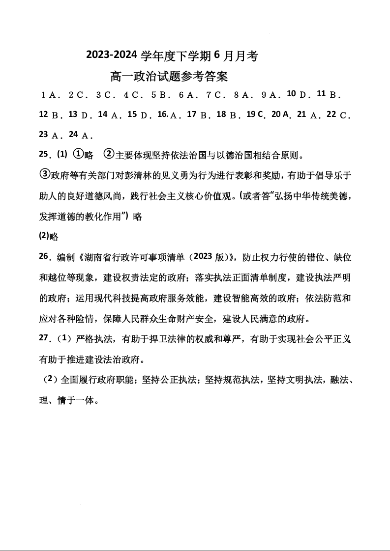 黑龙江省齐齐哈尔市第八中学校2023-2024学年高一下学期6月月考政治答案