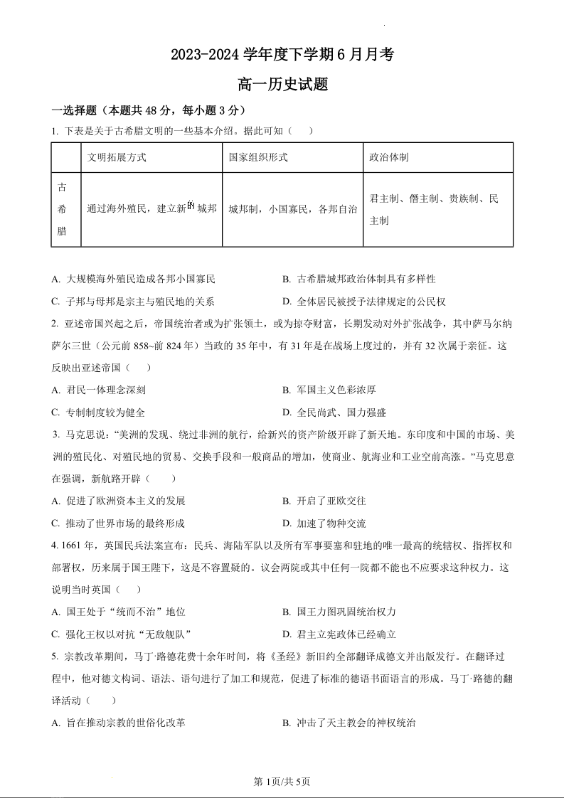 黑龙江省齐齐哈尔市第八中学校2023-2024学年高一下学期6月月考历史(原卷版)