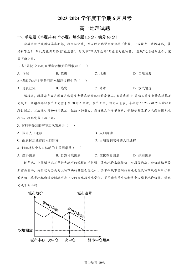 黑龙江省齐齐哈尔市第八中学校2023-2024学年高一下学期6月月考地理(原卷版)