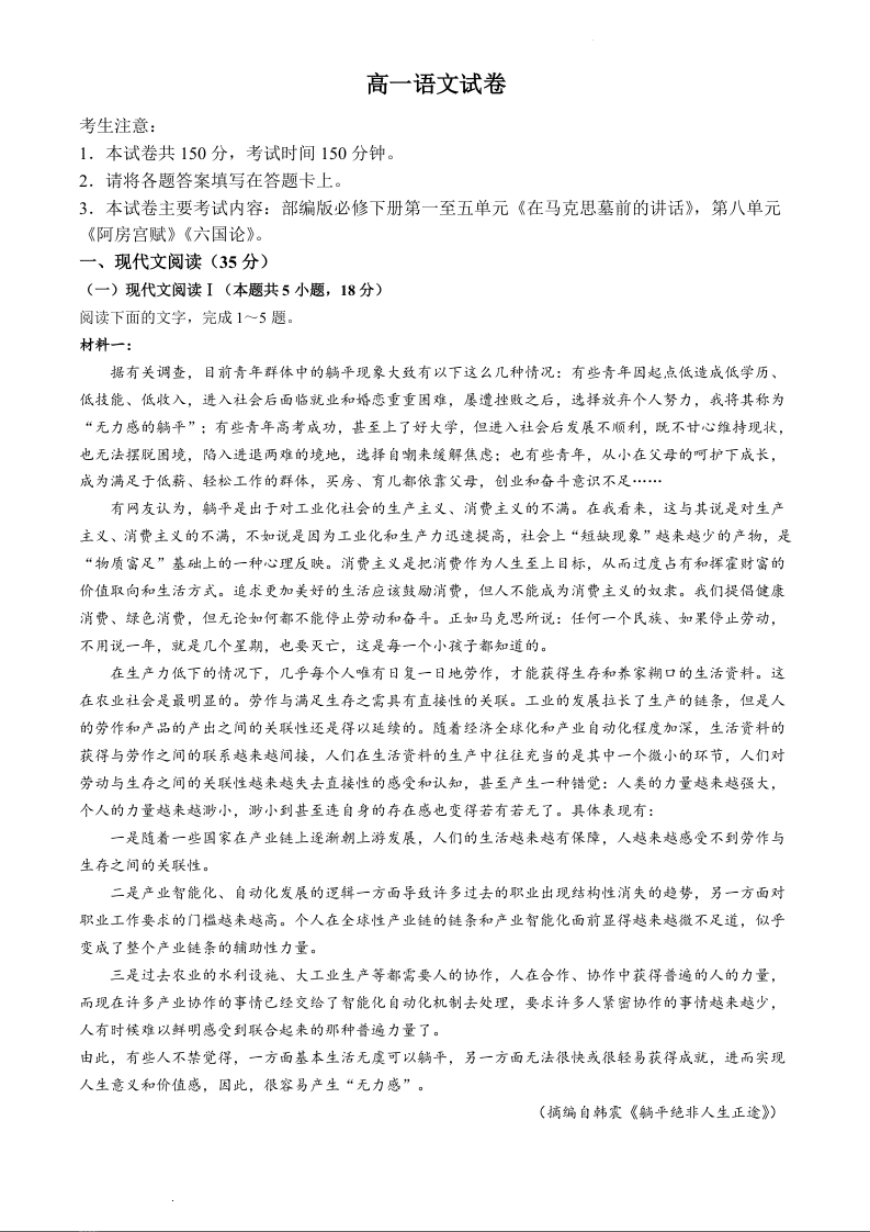 吉林省八校2023-2024学年高一下学期5月期中联考语文+答案