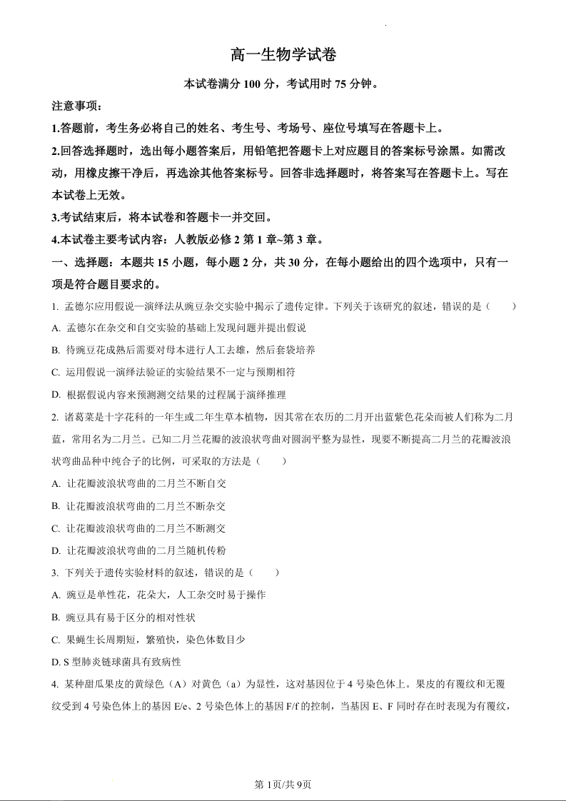 吉林省八校2023-2024学年高一下学期5月期中联考生物(原卷版)