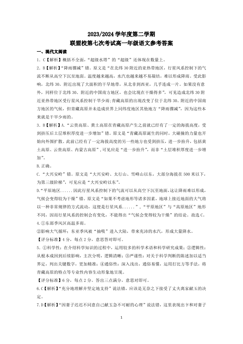 江苏省盐城市五校联盟2023-2024学年高一下学期5月月考语文答案