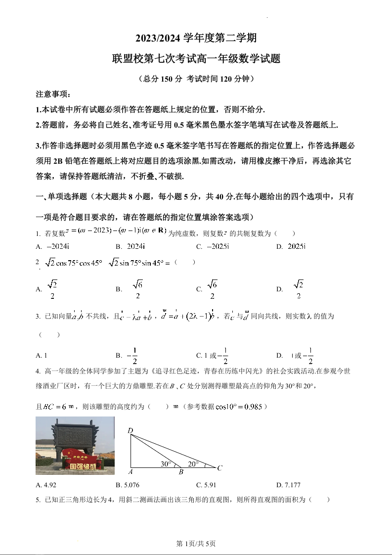 江苏省盐城市五校联盟2023-2024学年高一下学期5月月考数学(原卷版)