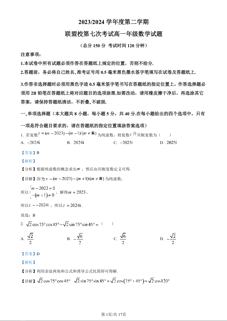 江苏省盐城市五校联盟2023-2024学年高一下学期5月月考数学(精品解析版)