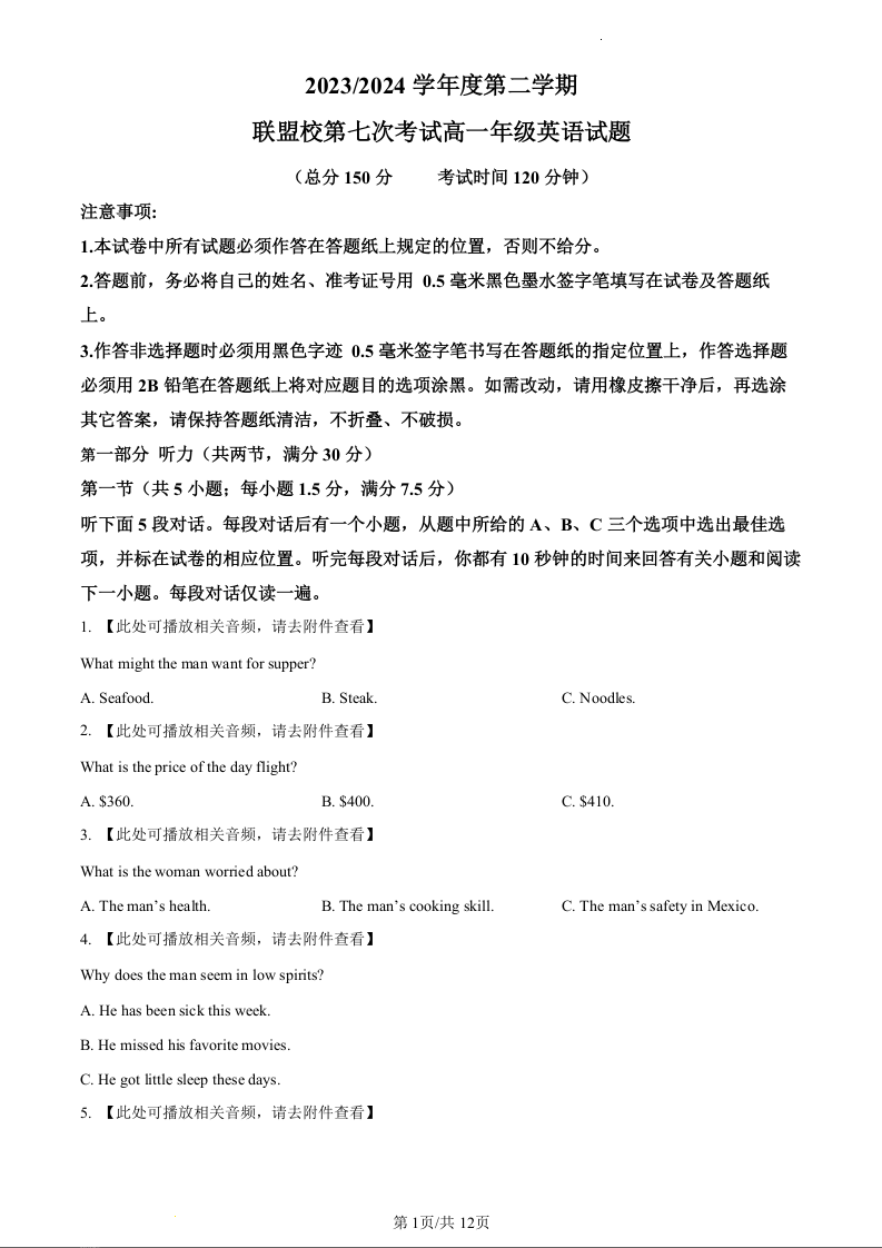 江苏省盐城市五校联盟2023-2024学年高一下学期5月月考英语(原卷版)