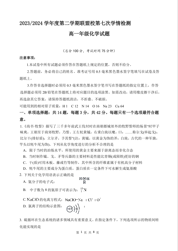 江苏省盐城市五校联盟2023-2024学年高一下学期5月月考化学
