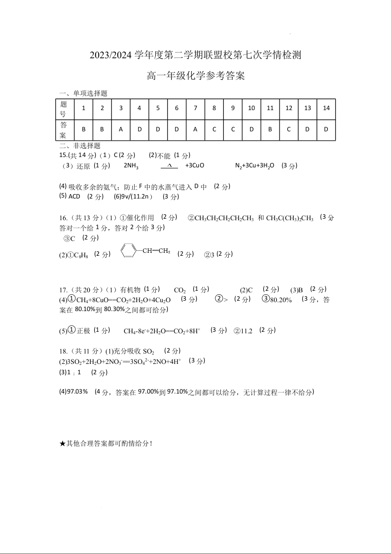 江苏省盐城市五校联盟2023-2024学年高一下学期5月月考化学答案