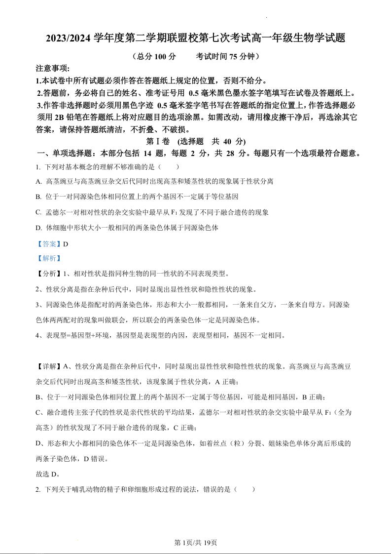 江苏省盐城市五校联盟2023-2024学年高一下学期5月月考生物(精品解析版)