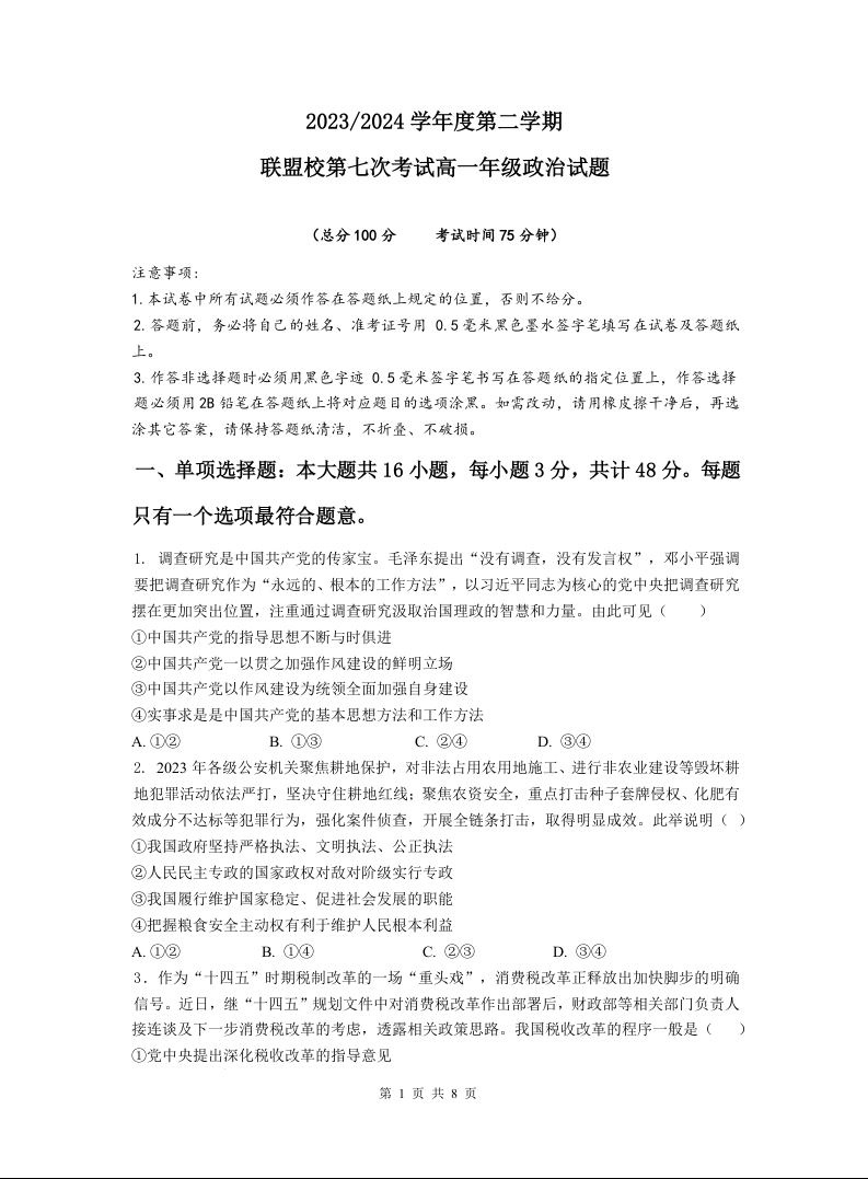 江苏省盐城市五校联盟2023-2024学年高一下学期5月月考政治
