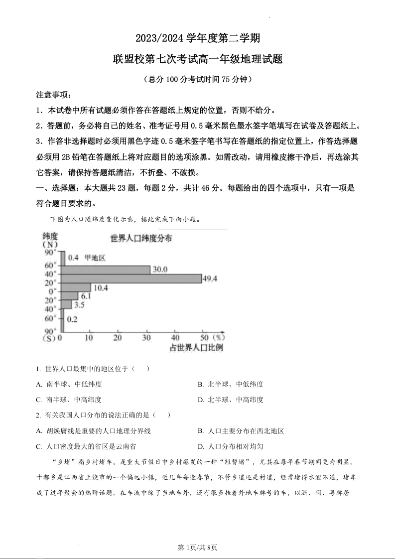 江苏省盐城市五校联盟2023-2024学年高一下学期5月月考地理(原卷版)
