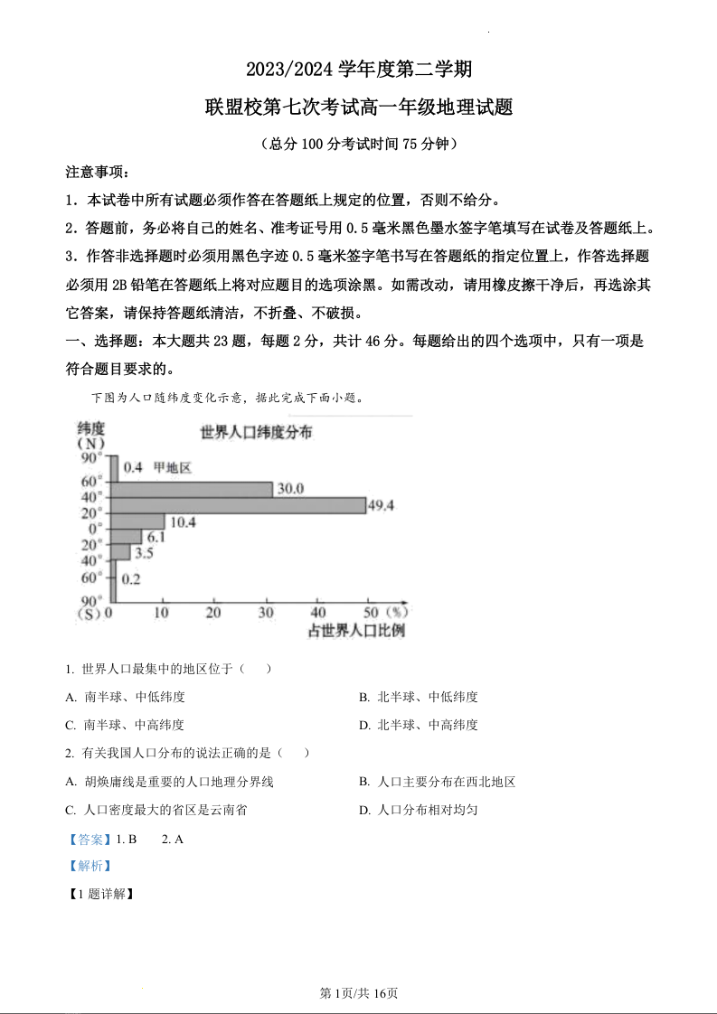江苏省盐城市五校联盟2023-2024学年高一下学期5月月考地理(精品解析版)
