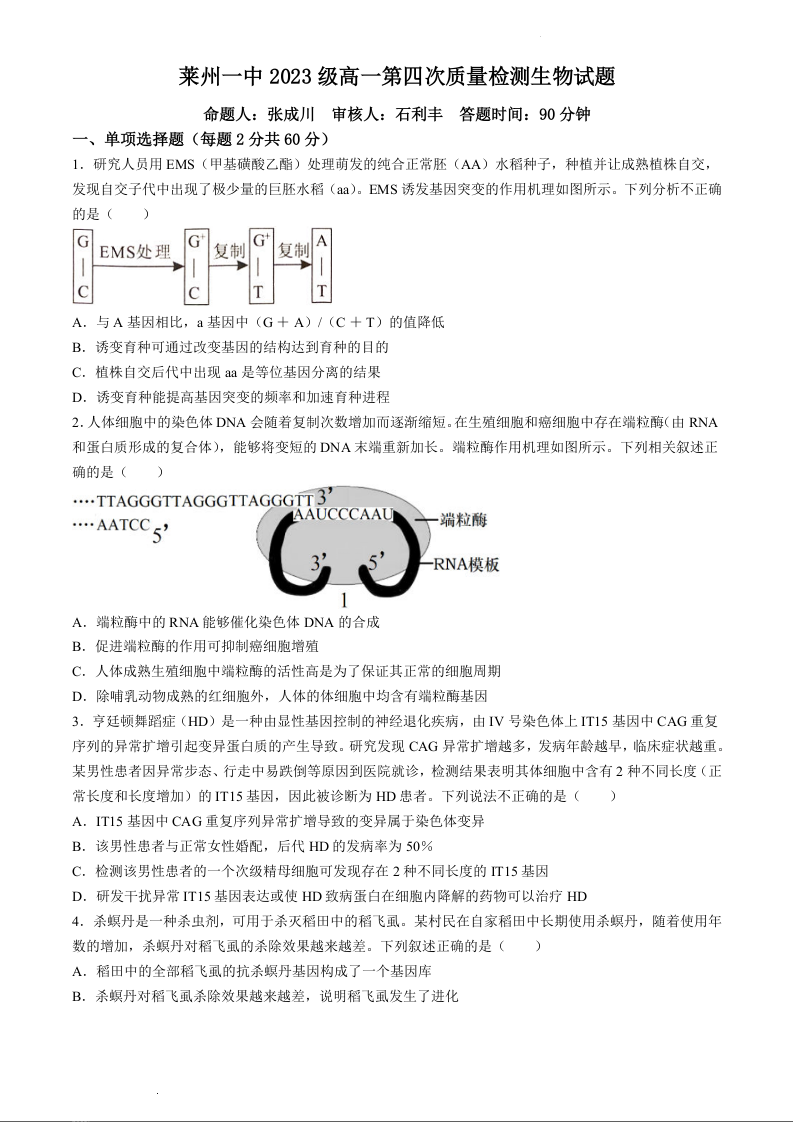 山东省烟台市莱州市第一中学2023-2024学年高一下学期6月月考生物