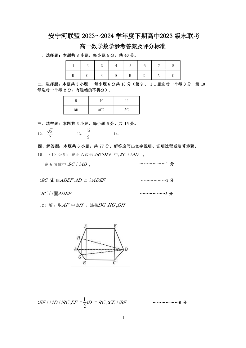 四川省凉山彝族自治州安宁河联盟2023-2024学年高一下学期期末考试数学答案