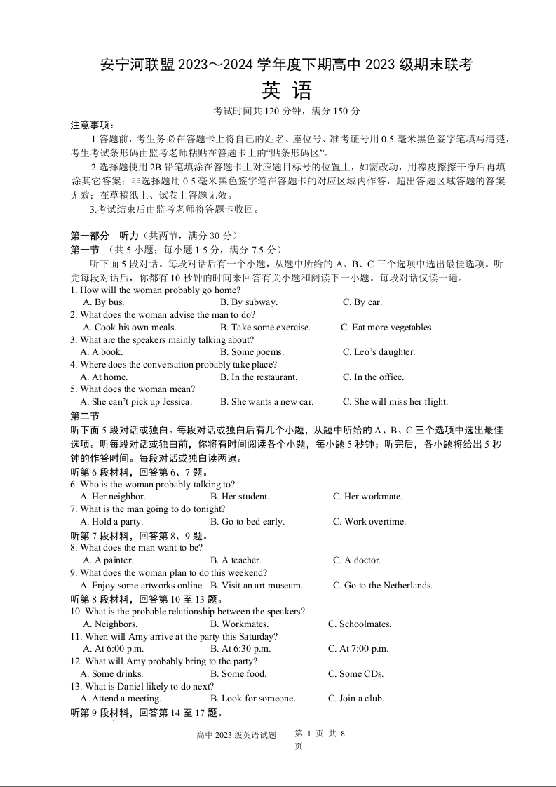 四川省凉山彝族自治州安宁河联盟2023-2024学年高一下学期期末考试英语