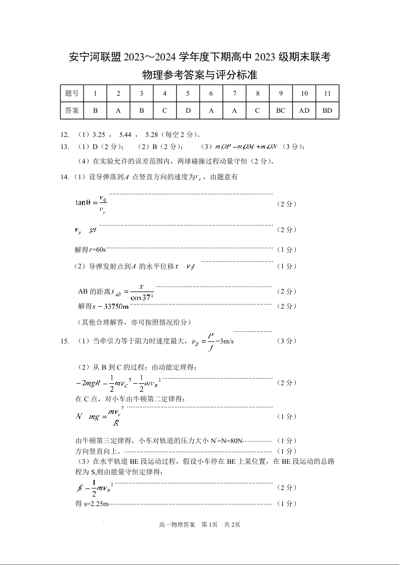 四川省凉山彝族自治州安宁河联盟2023-2024学年高一下学期期末考试物理答案