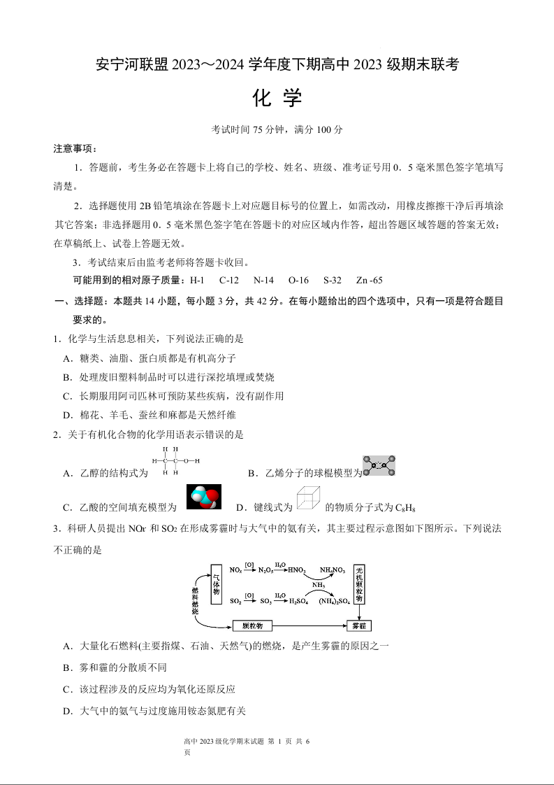 四川省凉山彝族自治州安宁河联盟2023-2024学年高一下学期期末考试化学