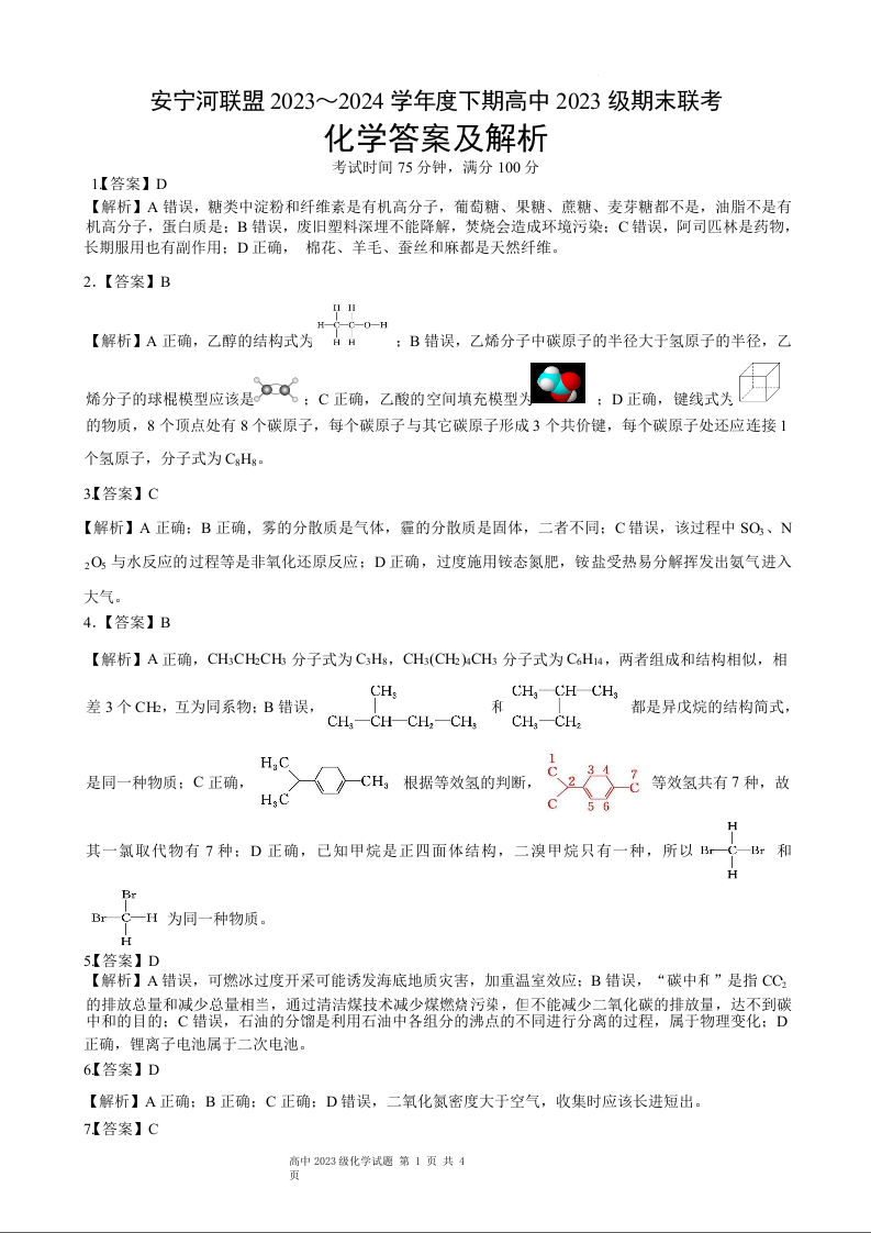 四川省凉山彝族自治州安宁河联盟2023-2024学年高一下学期期末考试化学答案