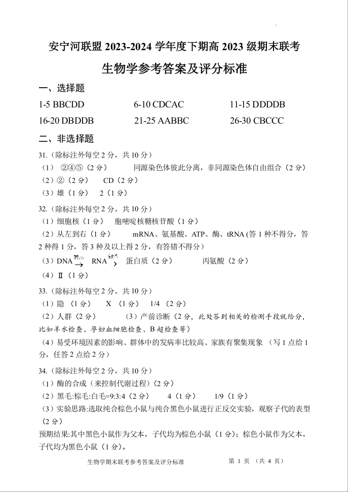 四川省凉山彝族自治州安宁河联盟2023-2024学年高一下学期期末考试生物答案