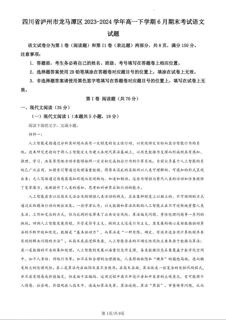 四川省泸州市龙马潭区2023-2024学年高一下学期6月期末考试语文(原卷版)