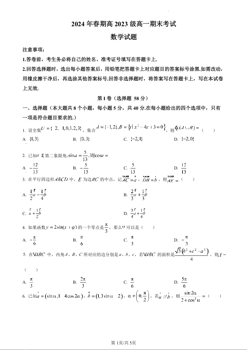 四川省泸州市龙马潭区2023-2024学年高一下学期6月期末考试数学(原卷版)