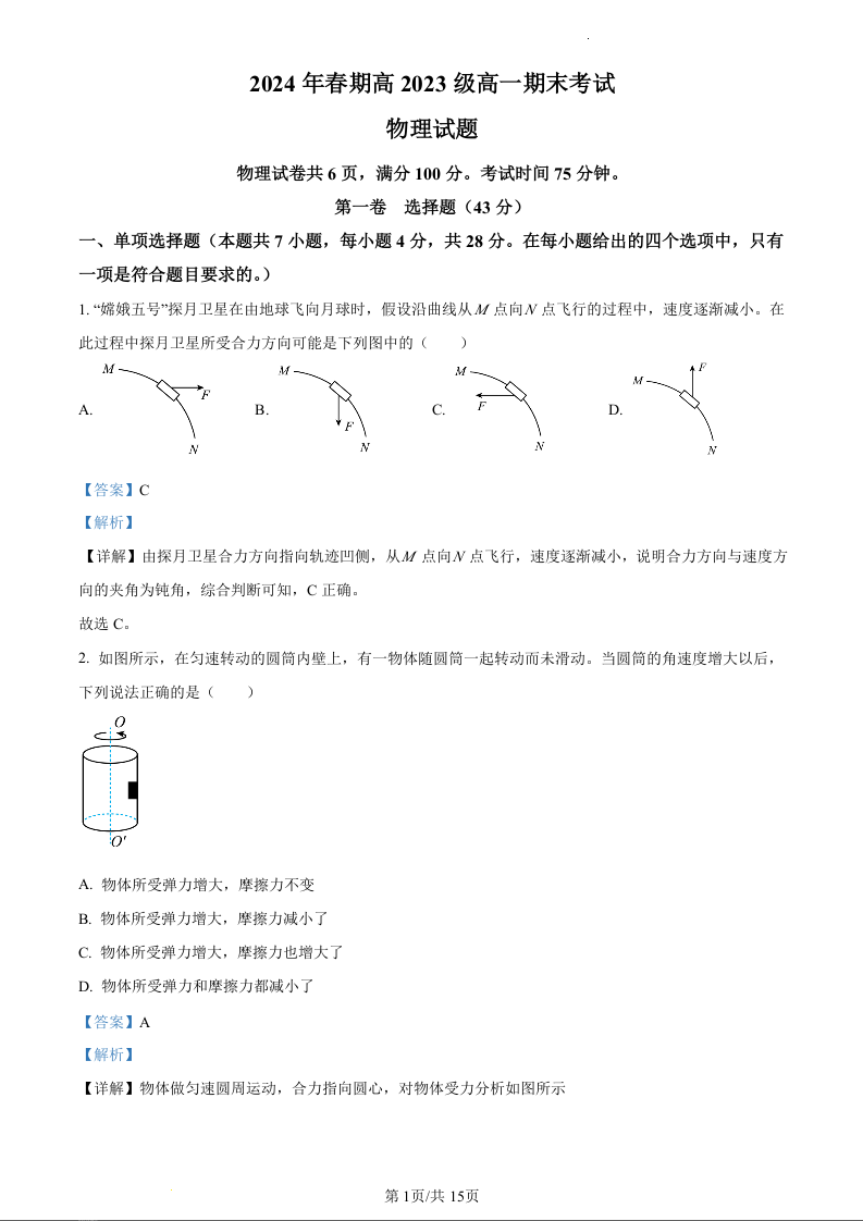 四川省泸州市龙马潭区2023-2024学年高一下学期6月期末考试物理(精品解析版)