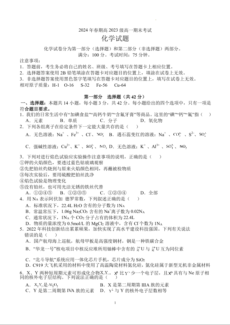 四川省泸州市龙马潭区2023-2024学年高一下学期6月期末考试化学