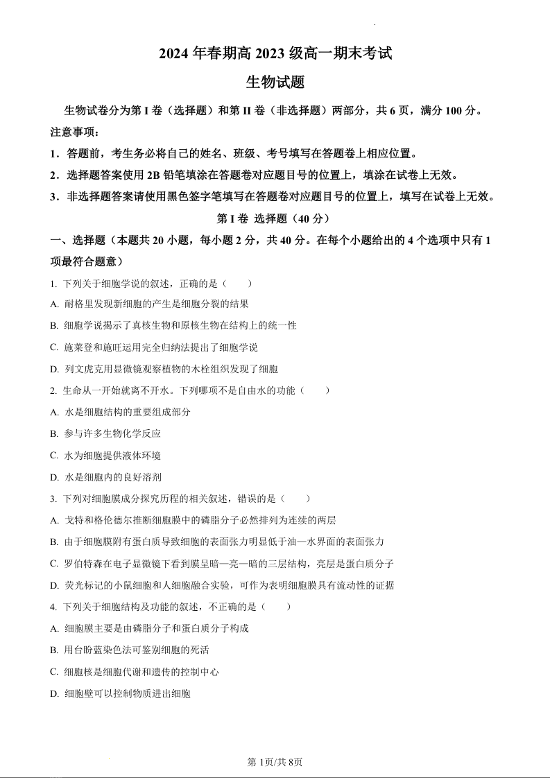 四川省泸州市龙马潭区2023-2024学年高一下学期6月期末考试生物(原卷版)