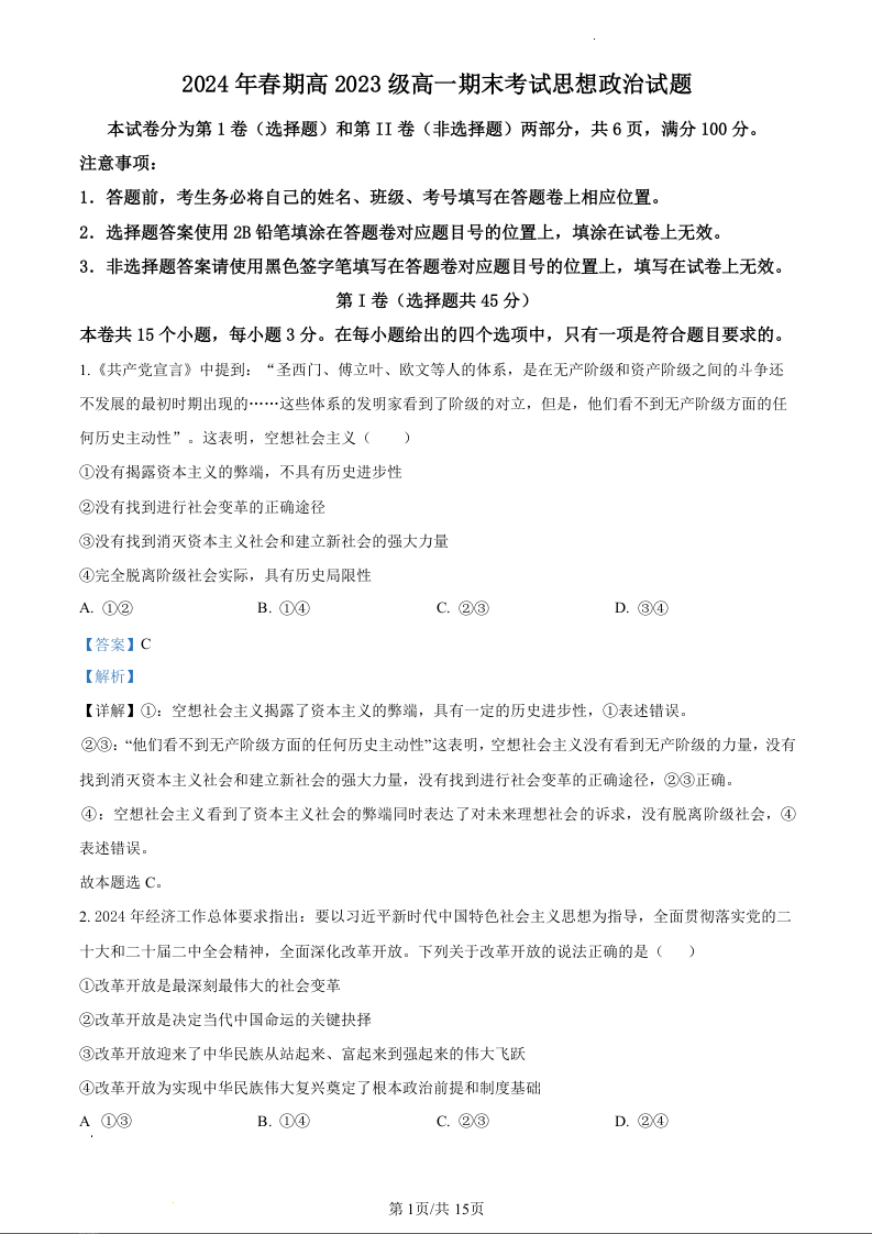 四川省泸州市龙马潭区2023-2024学年高一下学期6月期末考试政治(精品解析版)