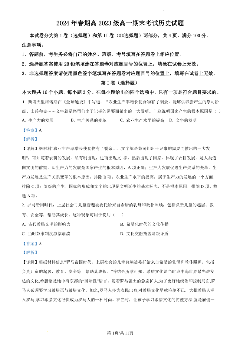 四川省泸州市龙马潭区2023-2024学年高一下学期6月期末考试历史(精品解析版)