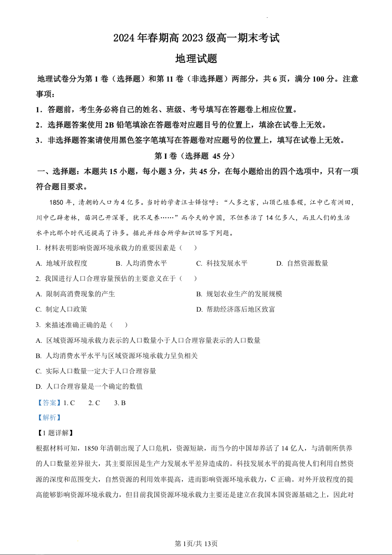四川省泸州市龙马潭区2023-2024学年高一下学期6月期末考试地理(精品解析版)
