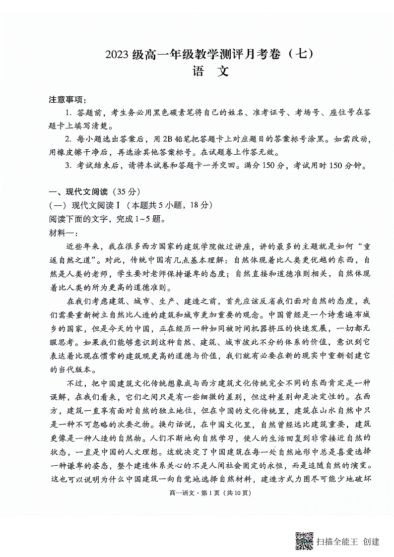 云南省云南师范大学附属中学2023-2024学年高一下学期5月月考语文