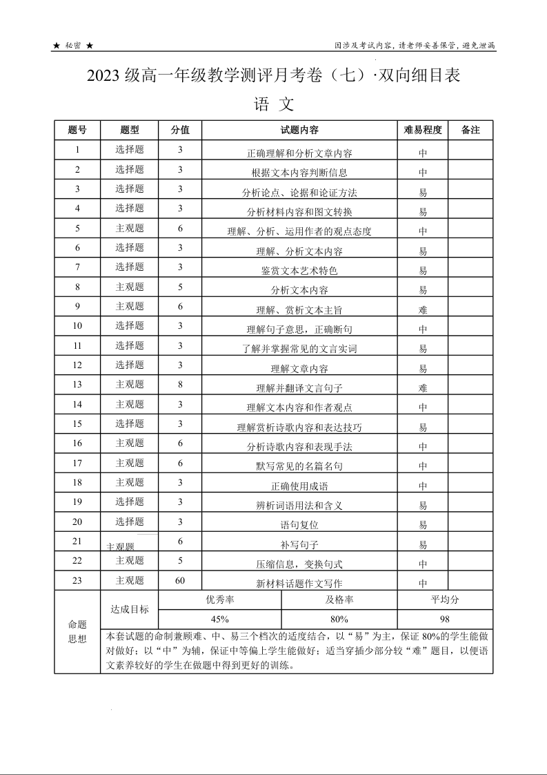 云南省云南师范大学附属中学2023-2024学年高一下学期5月月考语文双向细目表