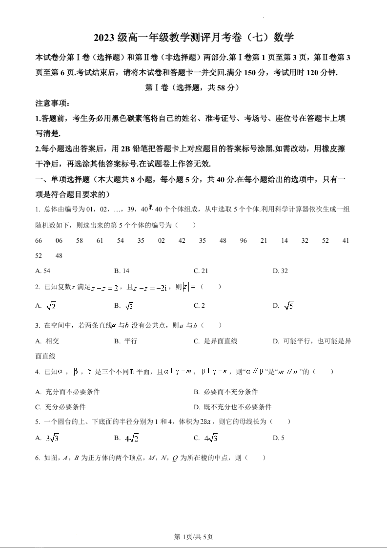 云南省云南师范大学附属中学2023-2024学年高一下学期5月月考数学(原卷版)