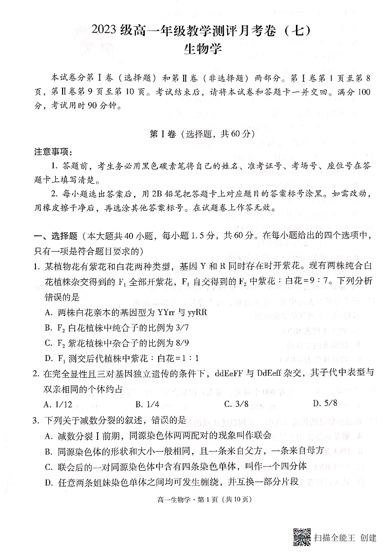 云南省云南师范大学附属中学2023-2024学年高一下学期5月月考生物