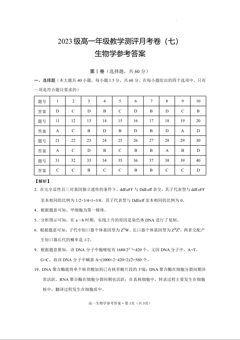 云南省云南师范大学附属中学2023-2024学年高一下学期5月月考生物答案
