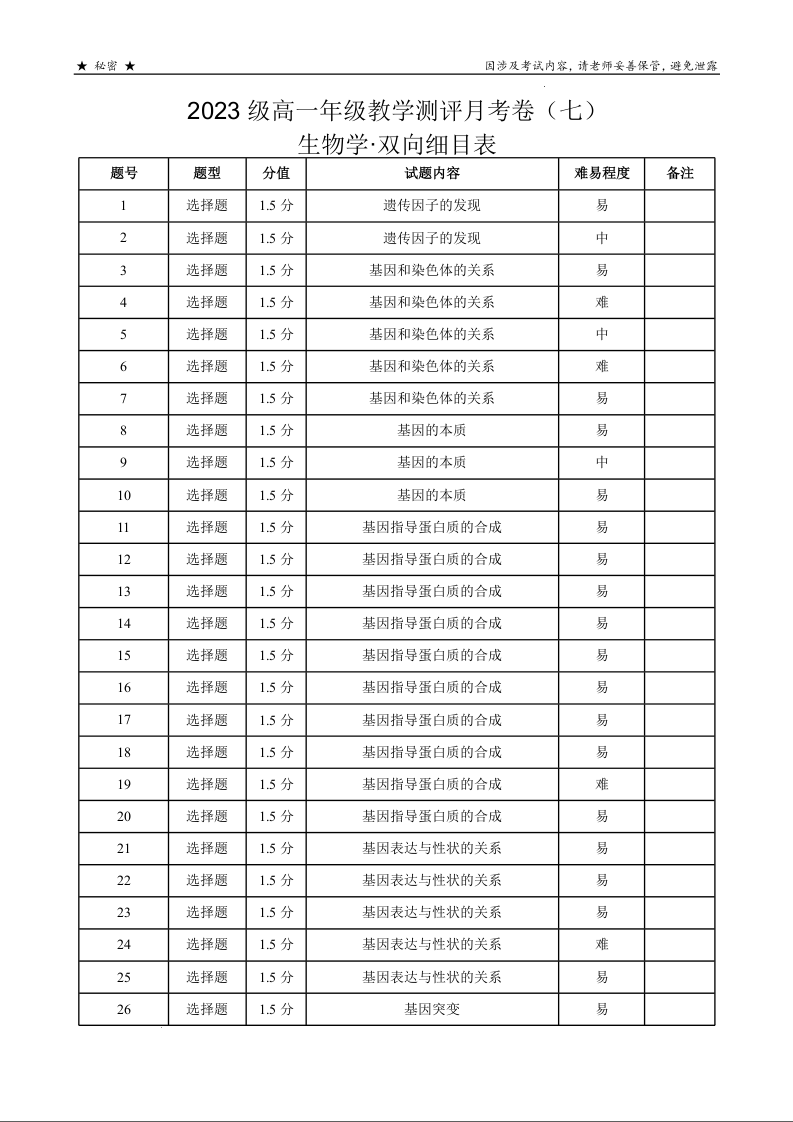 云南省云南师范大学附属中学2023-2024学年高一下学期5月月考生物双向细目表