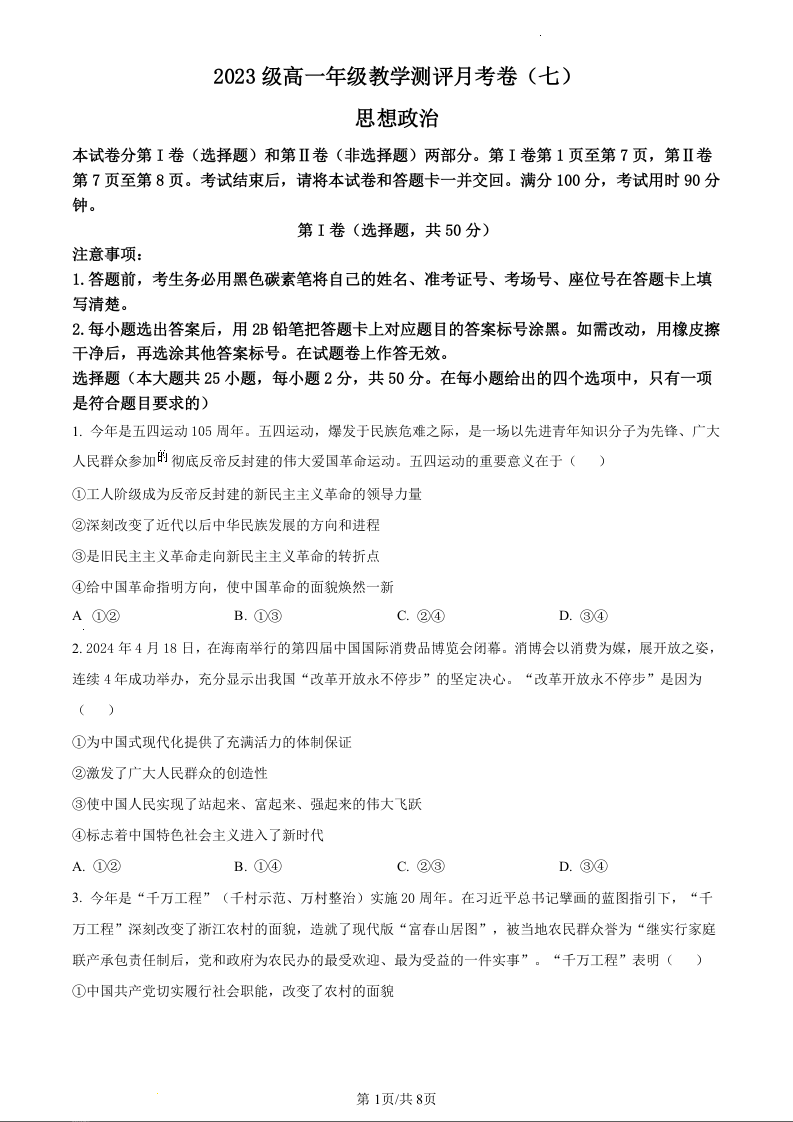 云南省云南师范大学附属中学2023-2024学年高一下学期5月月考政治(原卷版)