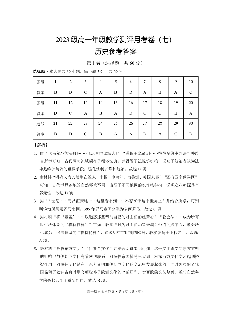 云南省云南师范大学附属中学2023-2024学年高一下学期5月月考历史答案