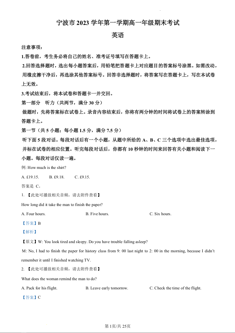 浙江省宁波市2023—2024学年高一上学期期末考试英语(精品解析版)
