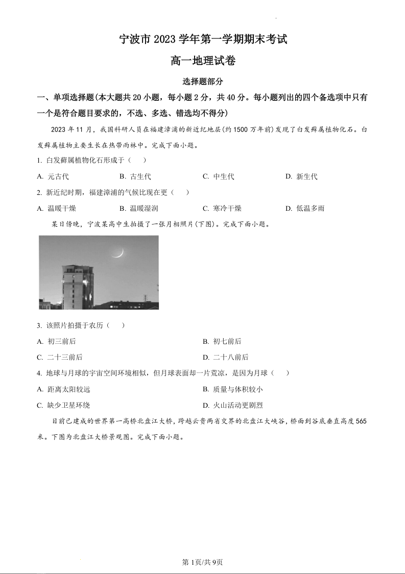 浙江省宁波市2023—2024学年高一上学期期末考试地理(原卷版)